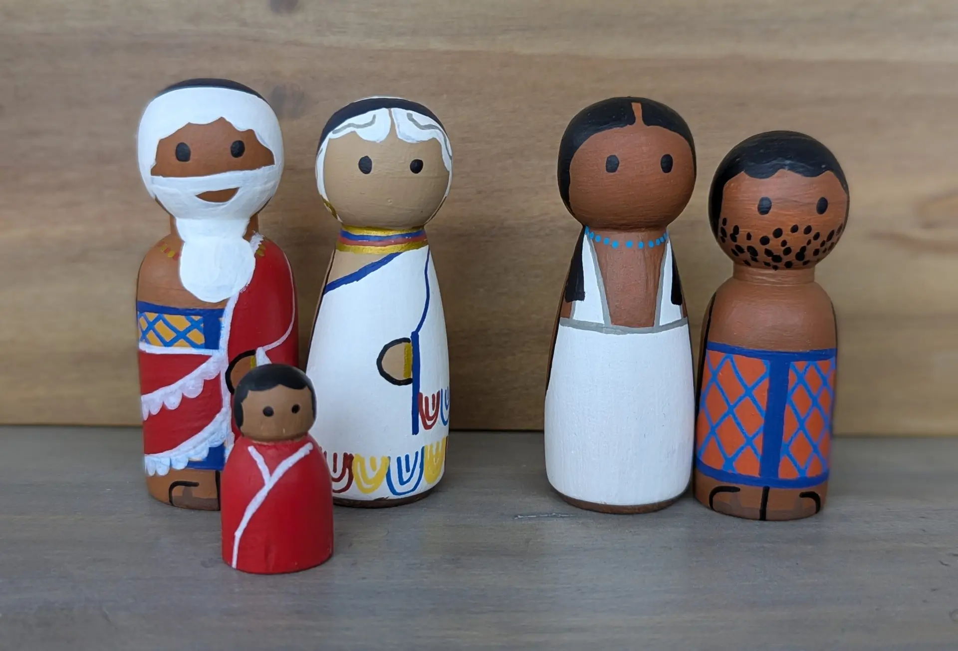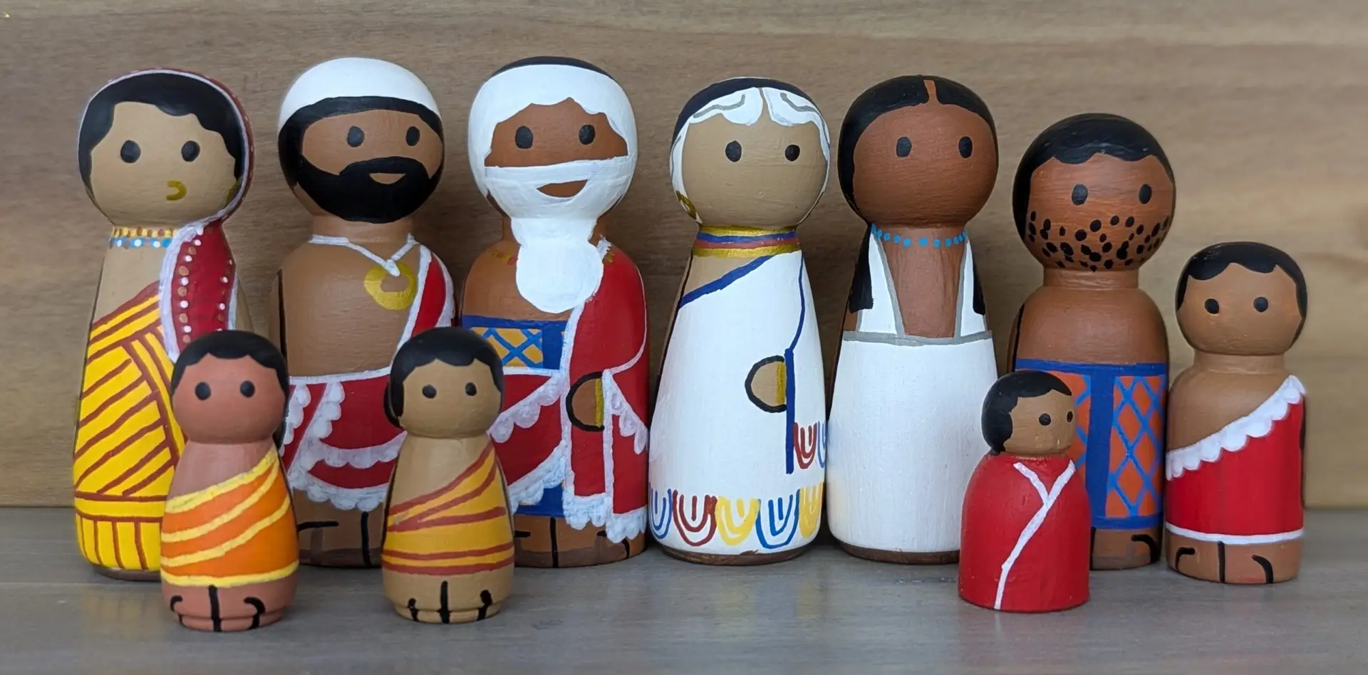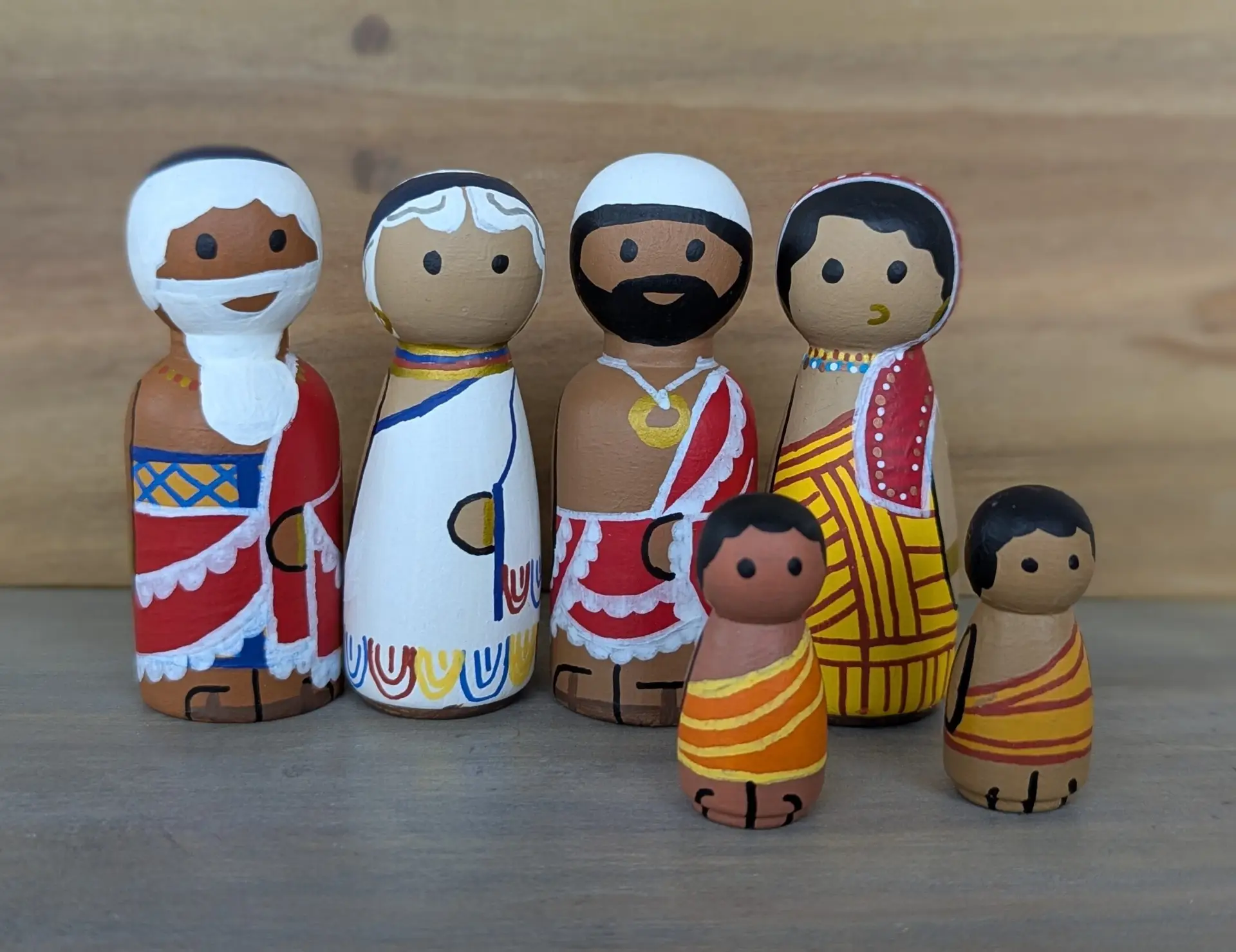 Every Bible peg people set has been carefully designed to reflect the ethnicity and cultures of the Old Testament. Each doll is inspired by specific archeological artifacts and frescos. These family heirlooms are not only toys but aim to also be theologically rich, historically accurate teaching tools.
